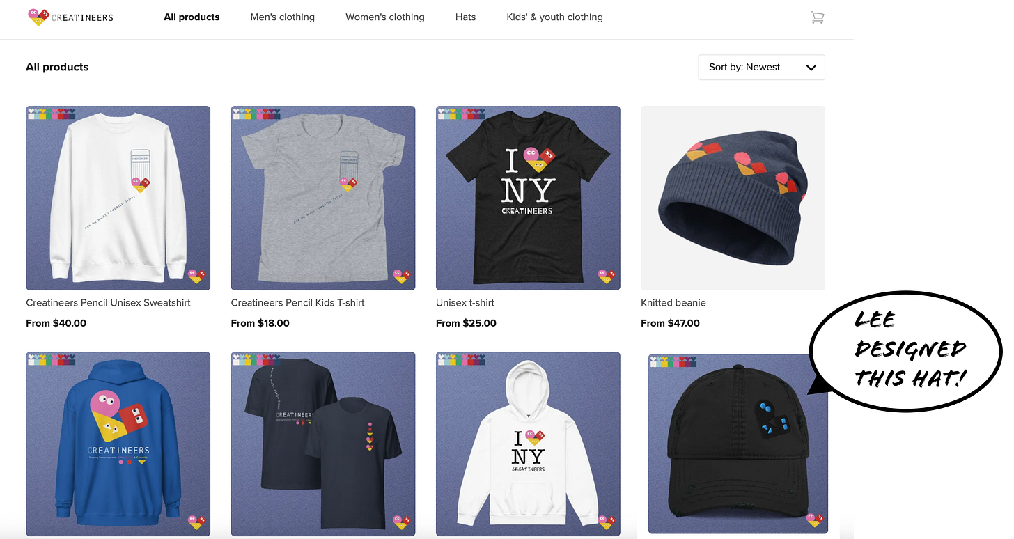 This love of swag has quietly turned into its own little sandbox. I have a CREATINEERS merch site that exists mostly for me right now (There is even a hat that Lee, my 8 year old son, designed on there!). I don’t publicize it. It’s just a place where I can experiment — design something, see how it looks on a hoodie or sticker, and make it real if I want to.