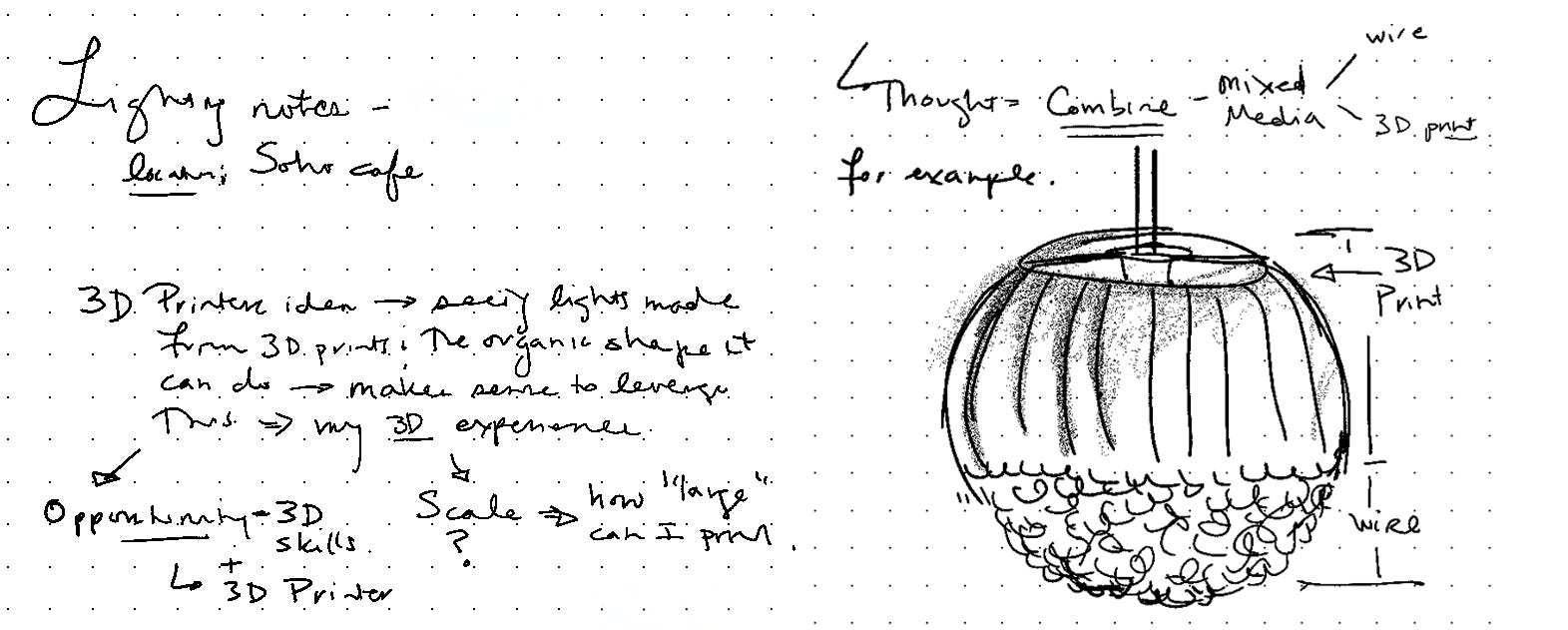 One thing I kept coming back to was diffusion. Wire alone could feel harsh as a light source. So my brain started going toward mixed materials. That’s where my 3D roots came back in. I started imagining combining wire with a 3D-printed form — something translucent, maybe a soft white — that could diffuse the light and balance out the structure.